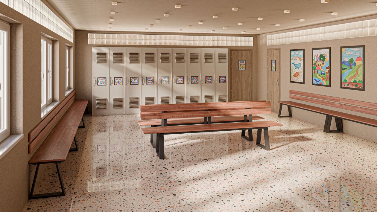 Kovinske noge so prašno barvane in opremljene z nastavljivo nivelacijo, kar omogoča enostavno prilagajanje neravnim površinam.
